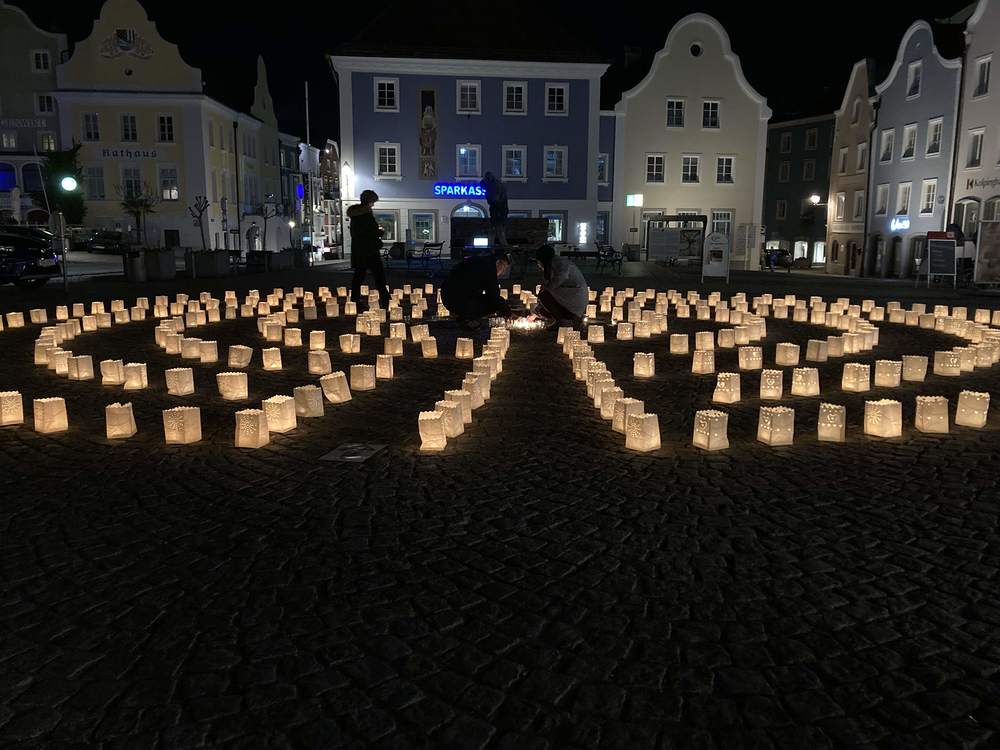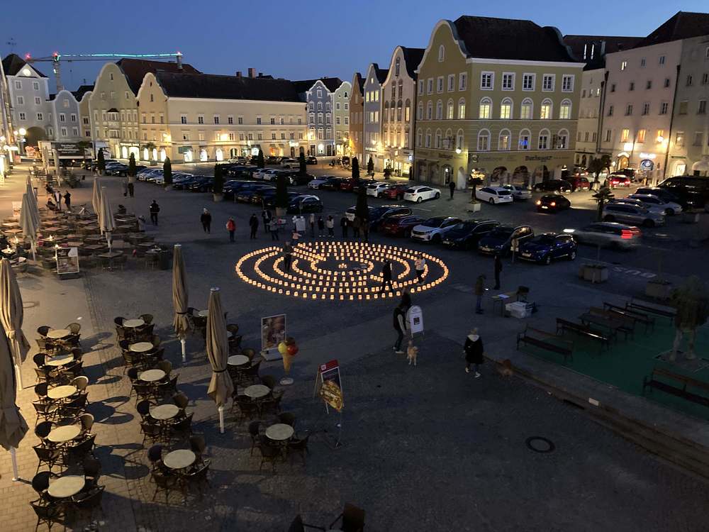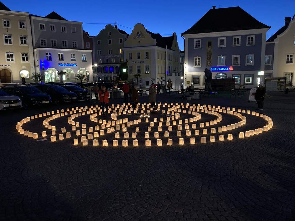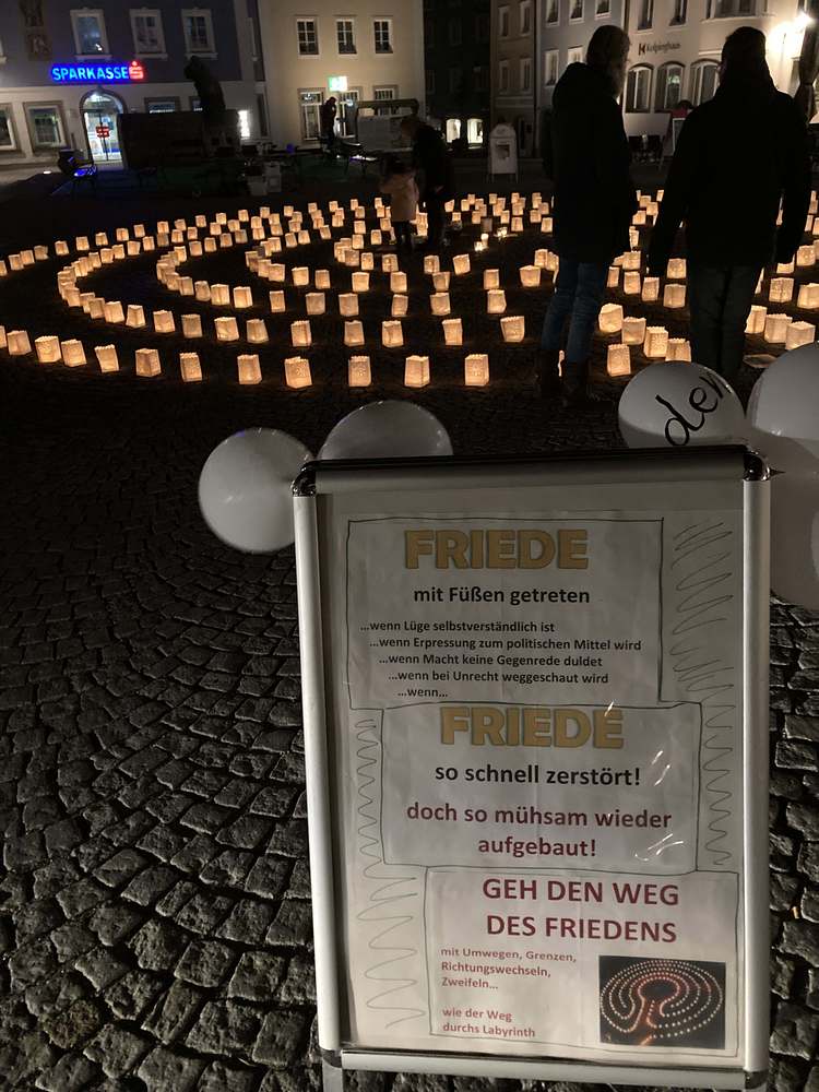 Die Menschen wurden eingeladen, ein Teelicht in einem Glas in die Mitte zu tragen. Es erforderte große Anstrengung, es brauchte oft mehrere Versuche. So verletzlich wie die kleine Flamme ist der Friede... Ein Friedenstext aus der Mitte begleitet die TeilnehmerInnen in den nächsten Tagen...